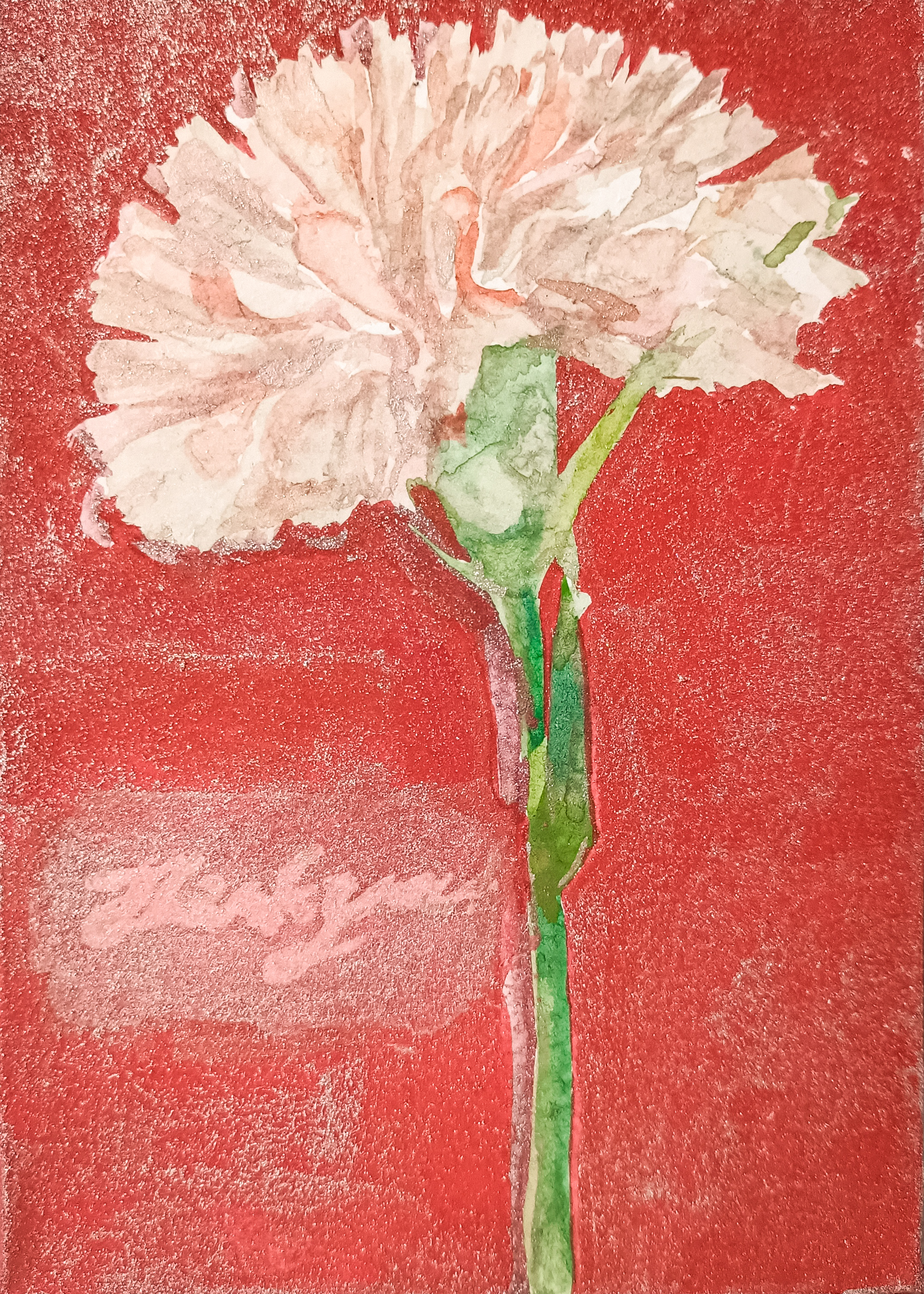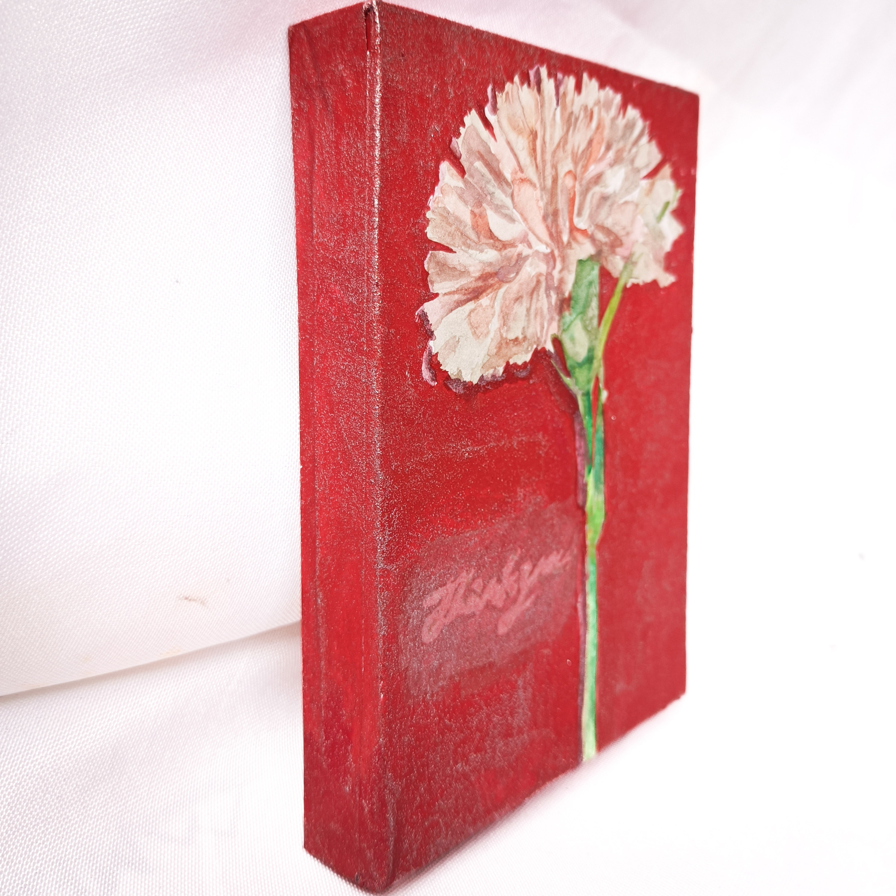 小さな赤いカーネーションを描きました。 贈り物にぴったりの一輪のカーネーションです。 透明水彩で軽やか、繊細、みずみずしく描きました。 透明水彩とアクリルガッシュの併用なので、 質感の違いが楽しめます。 達磨ピン、フックなどに掛ければそのまま壁に飾れます。 立てかけて飾ることもできます。