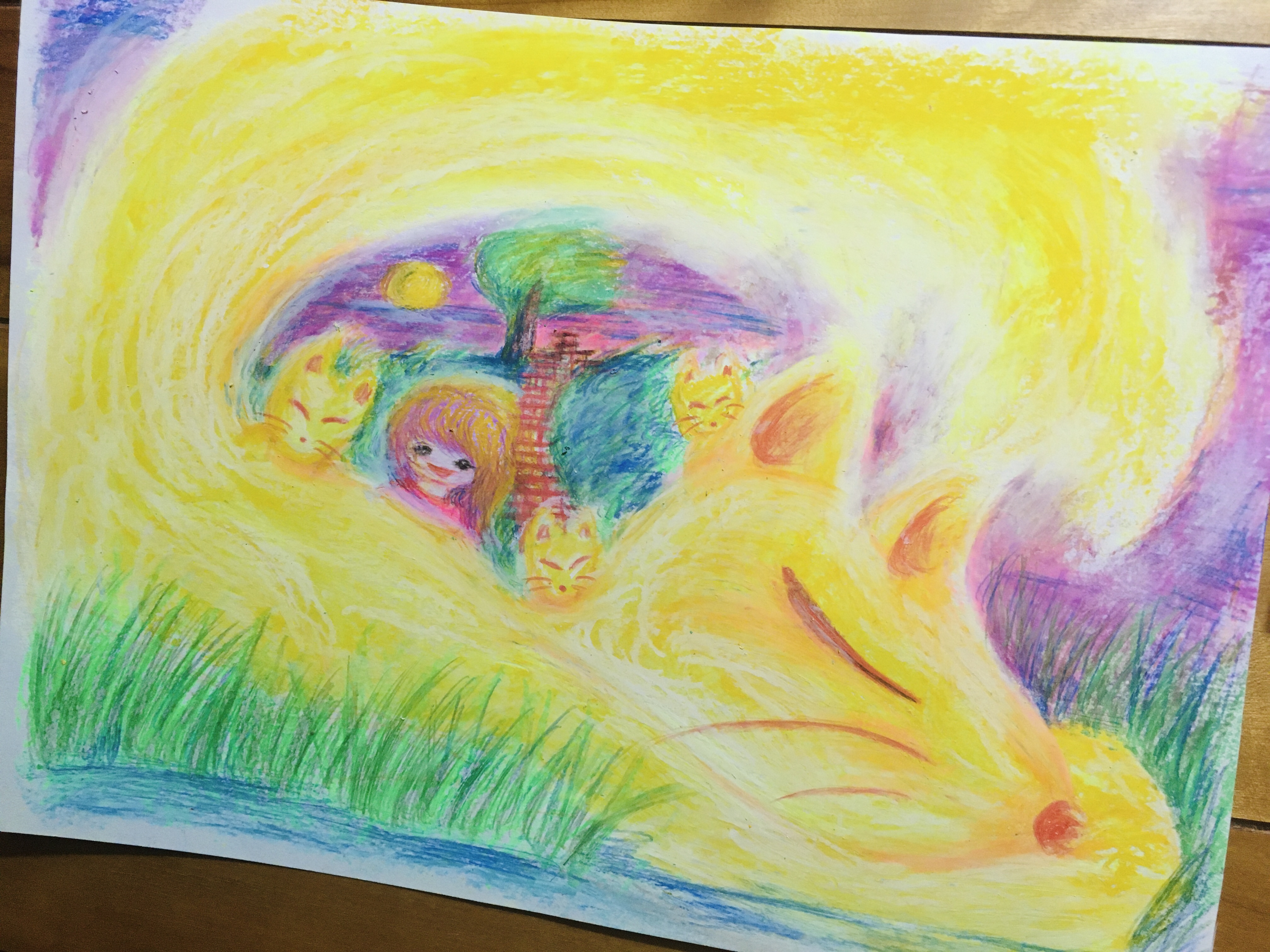 月夜の晩 神社⛩からこっそり抜け出した お狐さん 水田の水辺にて うたた寝中 子狐🦊と女の子が様子を 伺ってます サイズ:363×257mm(フレーム付き) 返品交換は承っておりません ご理解頂けましたらありがたいです m(_ _)m