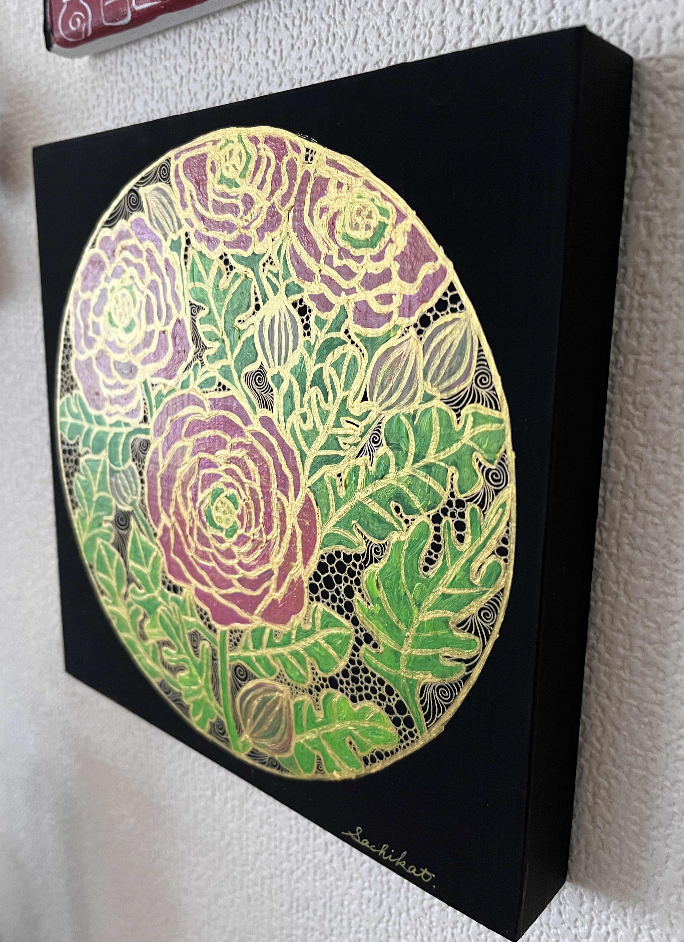 小さめサイズで軽量なので、お部屋のちょっとしたスペースにも飾っていただけます。(写真は壁に刺した画びょうに絵を掛けて展示しています)