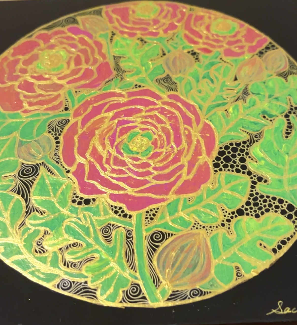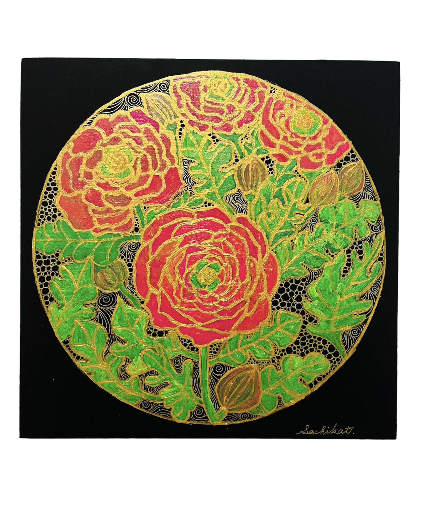 柔らかくしっとりした花びらを幾重にも重ねた、華やかで落ち着いた姿を細密画模様をあしらって鮮やかに描き上げた作品です。