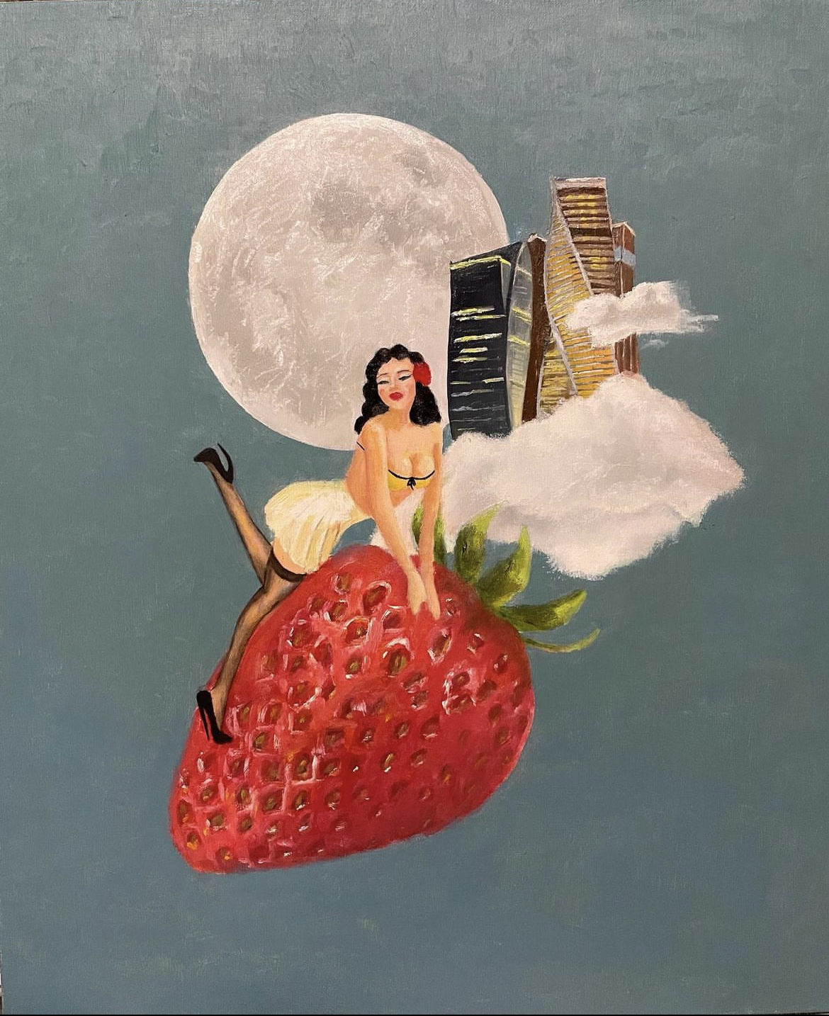 この作品は、昭和レトロな画像をコラージュし、油絵で描きました。画像で見るよりも実物の方が月やいちごのリアルさがわかりますよ!いちご美味しそうでしょ?