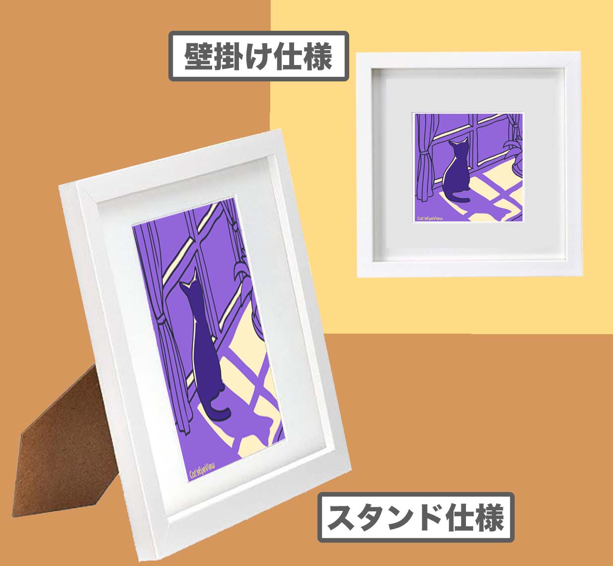 額装したプリント作品として提供します。 お部屋の壁掛け、およびスタンドの両方式で飾ることができます。