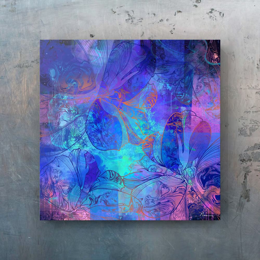 暗さが生む寂しさ、暗かったから見える星空、物思いにふける夜など「夜』というキーワードを軸に暗い世界を鮮やかな色合いで制作してみた抽象画です。中心部から少し下の明るい水色部分の花びらを辿ると男女の横顔のシルエットが浮かび上がります。