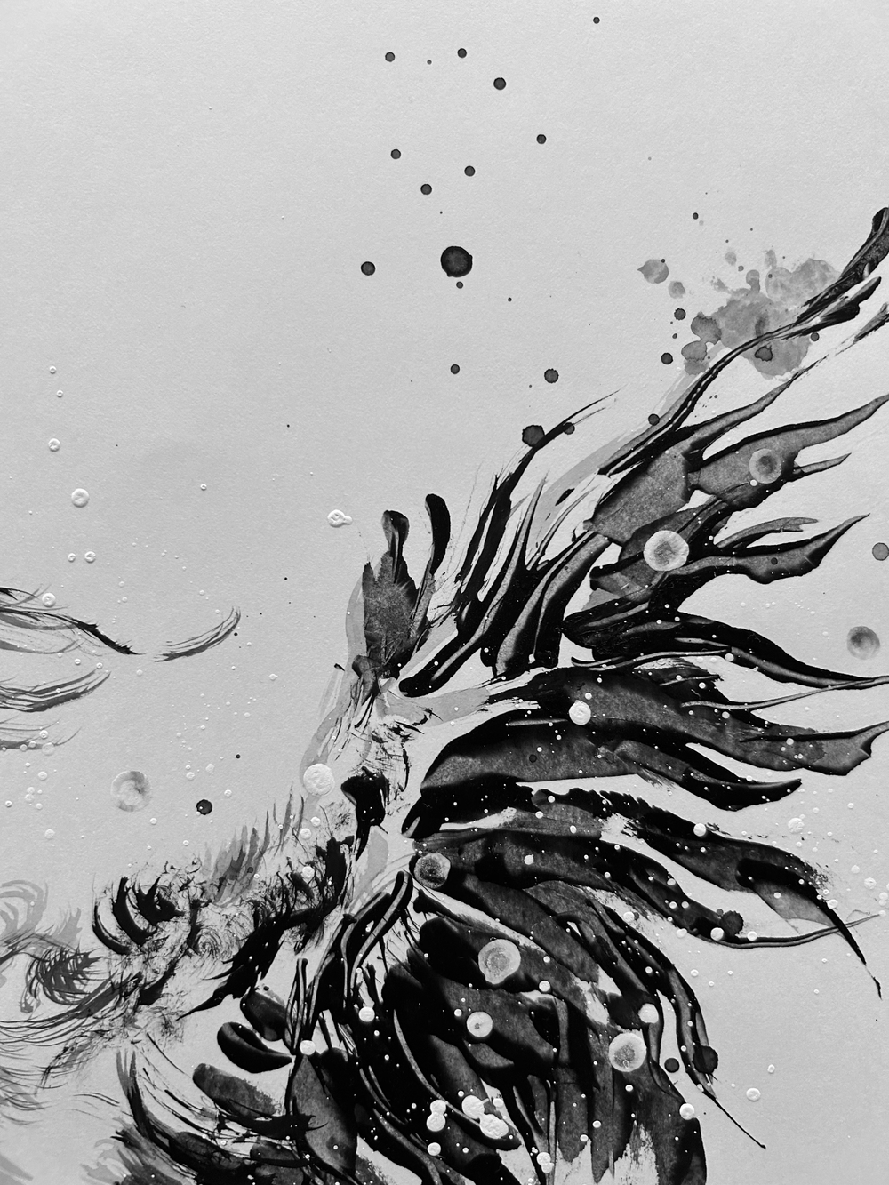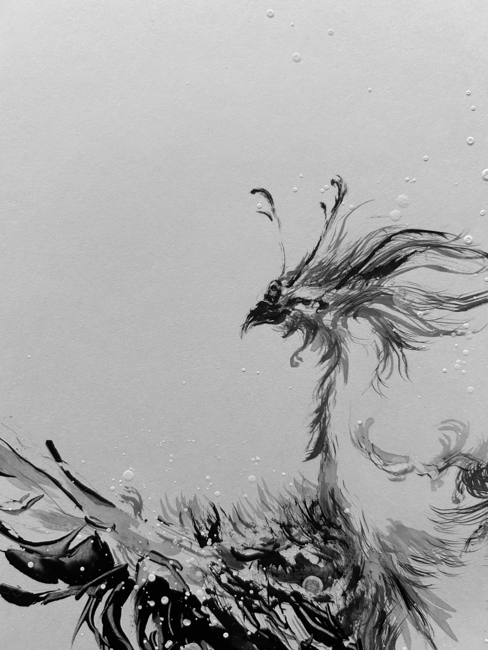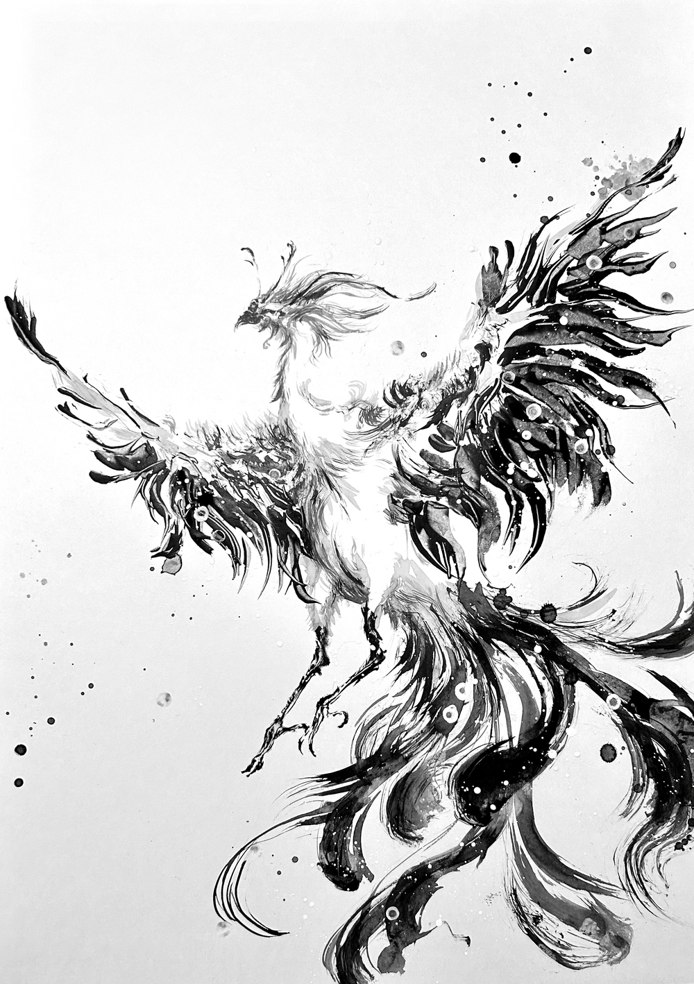 虹色の色を持つ鳳凰を墨で表現し、