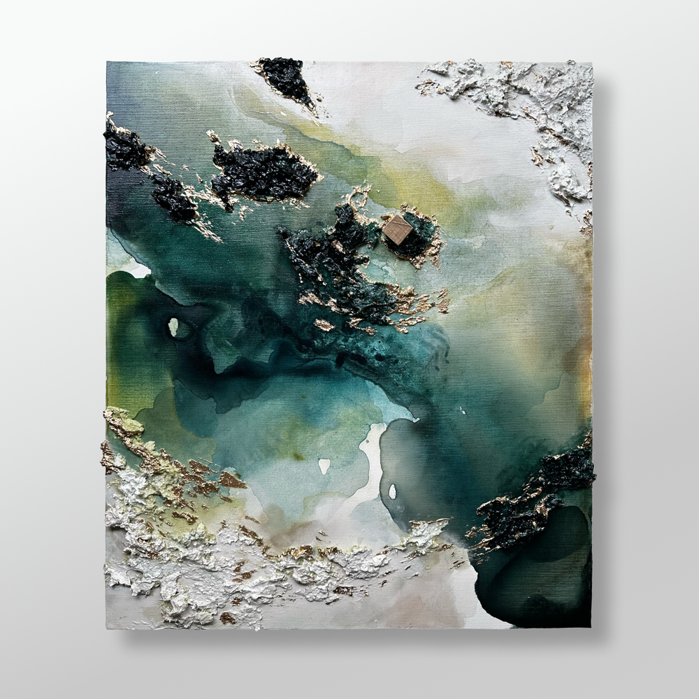 我々の無意識における規則性を描いた作品です。本作品におけるゴツゴツとしたテクスチャーは地球の⼤地を⽰し、⽔でぼかして描かれた部分は⽔や湖を、四⾓いオブジェクトは⽊材を使⽤しており、天然⽯や鉱物から着想を得ています。