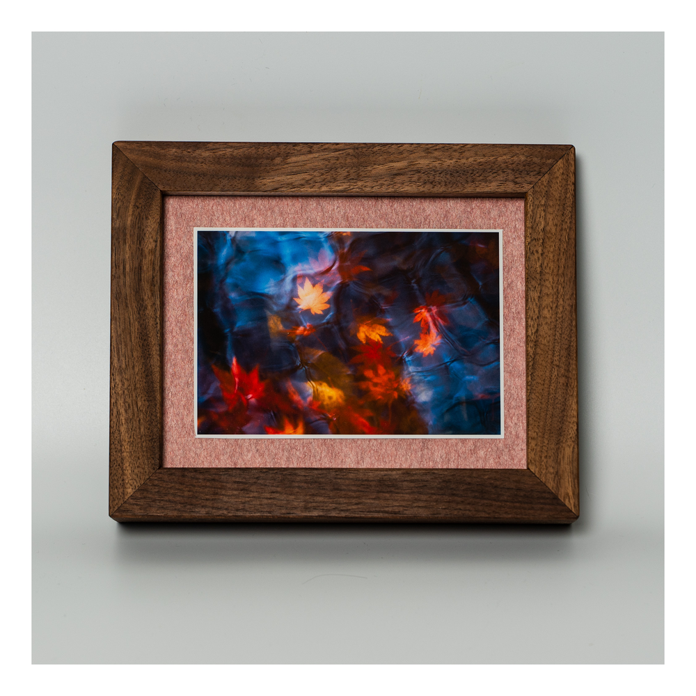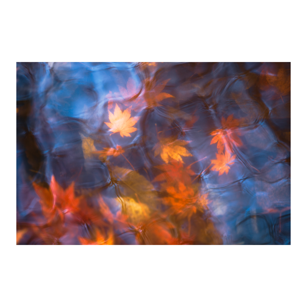 水面に落ちたもみじの葉と水面の揺らぎを写した一枚です。