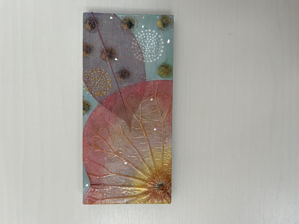 蓮の葉、ゴムの葉を使って、お天気の良い日に春の訪れを知らせてくれている様子を表現してみました。