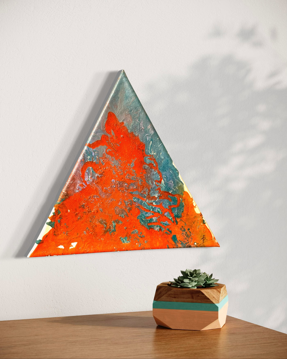 この作品「侵食」は、静かに、しかし確実に心の奥底を蝕む感情の奔流を描いています。三角形のキャンバスを覆う鮮烈なオレンジと、そこから滲み出すような青緑の色彩は、侵食されていく心の葛藤を表現しているかのようです。見る者の心を揺さぶり、内に秘めた感情を呼び覚ますような、力強い作品です。
