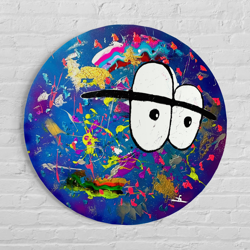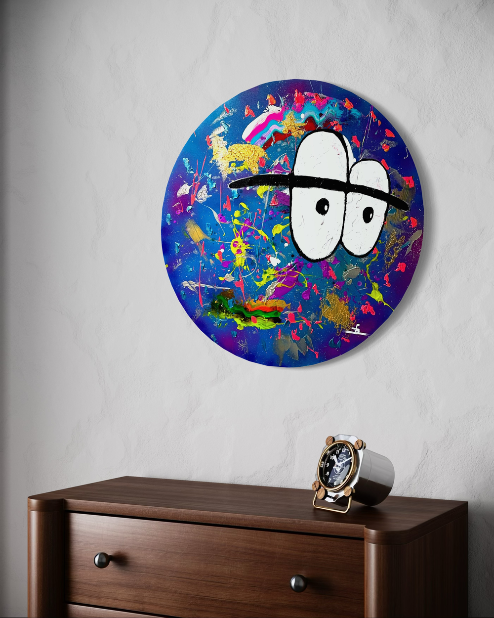 「宇宙って、実はすごく楽しい場所なんじゃないか?」そんなメッセージが込められているような、ポップで遊び心あふれる作品です。キャンバスを覗き込む二つの目は、まるで私たちを宇宙のパーティーに誘っているかのよう。背景の鮮やかな色彩は、宇宙のエネルギーが爆発している様子を表現しているのでしょうか?この作品を見ていると、心が解放され、自由な気持ちになれます。