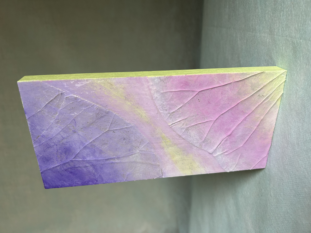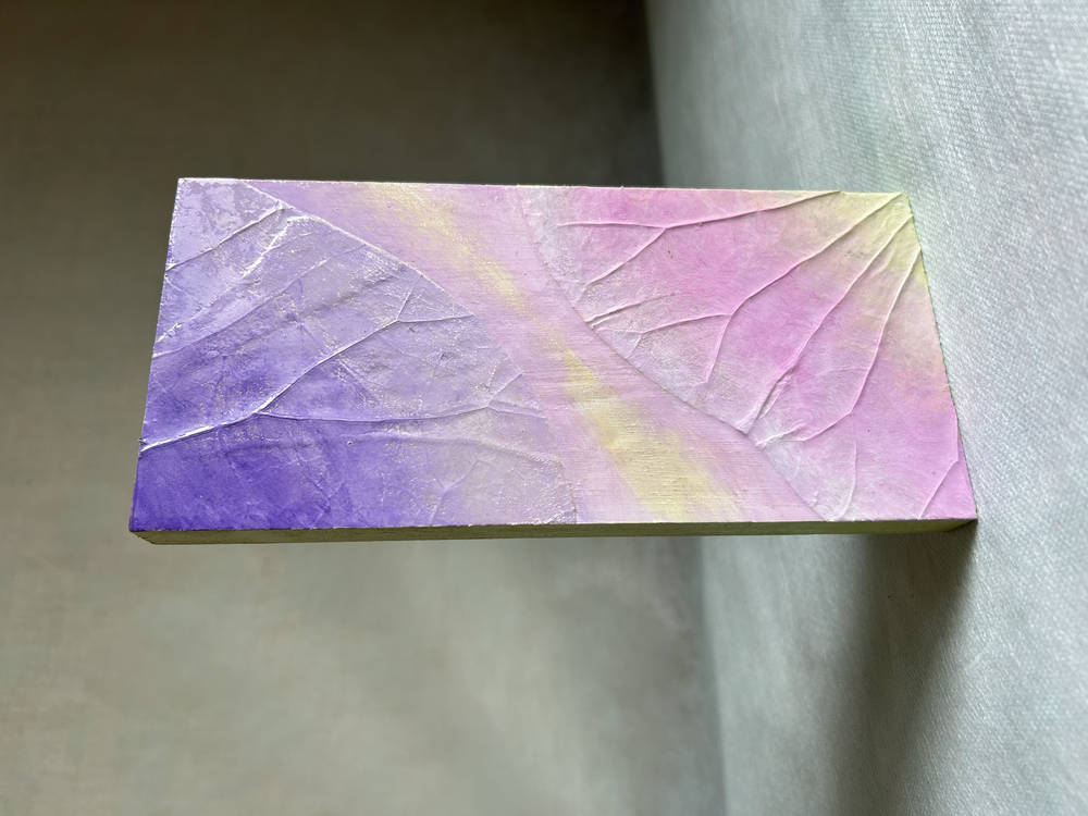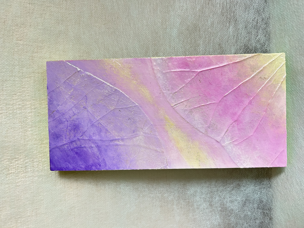 桐板に蓮の葉を貼りアクリル絵の具で着色しています。