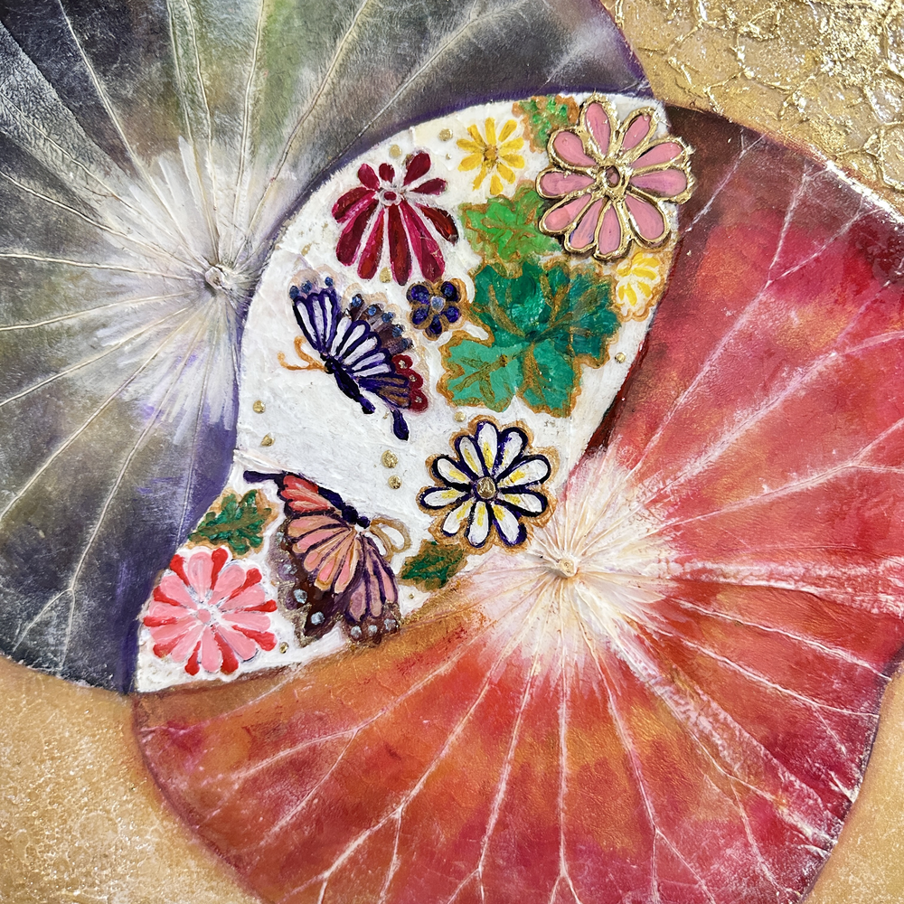 花の周りで蝶が舞い、着物模様を思わせる華やかな和柄