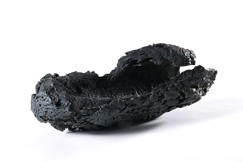 ガラスにアルミ箔を混ぜることで、偶然にも溶岩に似た質感が出現する。ガラスという自然に由来する素材が持つ特性を引き出す独自の表現技法により、視覚的な美しさと自然とのつながりを強く感じる事ができる。それは単なる自然物の再現ではなく、自然物を自身の感性を通じて形作ったものである。本作を通じて自然物の本質を追求しながら人工物としてのガラスの表現が持つ特異性を強調し、自然と人間の営みが交錯したものとして「自然物と人工物の間(あわい)」というテーマを探っていく。