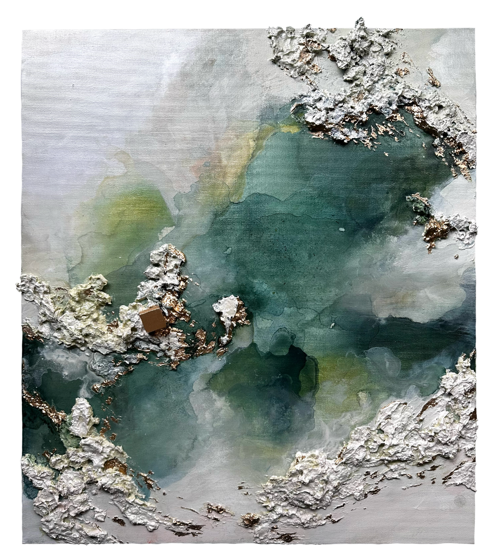 我々の無意識における規則性を描いた作品です。本作品におけるゴツゴツとしたテクスチャーは地球の⼤地を⽰し、⽔でぼかして描かれた部分は⽔や湖を、四⾓いオブジェクトは⽊材を使⽤しており、天然⽯や鉱物から着想を得ています。
