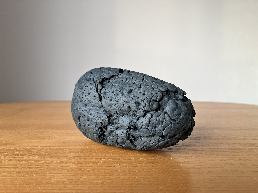ガラスにアルミ箔を混ぜることで、偶然にも溶岩に似た質感が出現する。ガラスという自然に由来する素材が持つ特性を引き出す独自の表現技法により、視覚的な美しさと自然とのつながりを強く感じる事ができる。それは単なる自然物の再現ではなく、自然物を自身の感性を通じて形作ったものである。本作を通じて自然物の本質を追求しながら人工物としてのガラスの表現が持つ特異性を強調し、自然と人間の営みが交錯したものとして「自然物と人工物の間(あわい)」というテーマを探っていく。