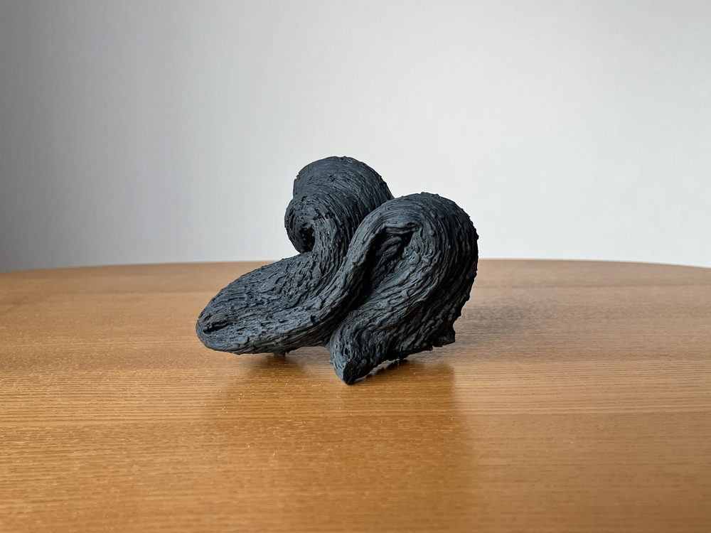 ガラスにアルミ箔を混ぜることで、偶然にも溶岩に似た質感が出現する。ガラスという自然に由来する素材が持つ特性を引き出す独自の表現技法により、視覚的な美しさと自然とのつながりを強く感じる事ができる。それは単なる自然物の再現ではなく、自然物を自身の感性を通じて形作ったものである。本作を通じて自然物の本質を追求しながら人工物としてのガラスの表現が持つ特異性を強調し、自然と人間の営みが交錯したものとして「自然物と人工物の間(あわい)」というテーマを探っていく。