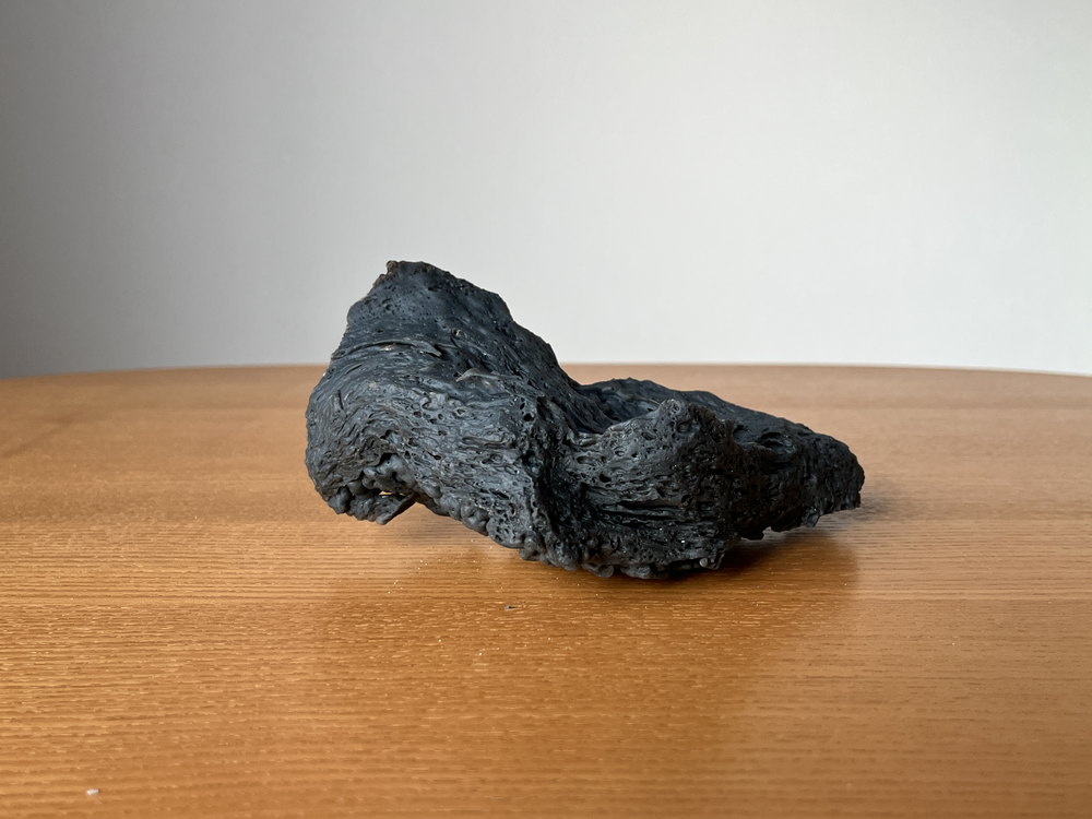ガラスにアルミ箔を混ぜることで、偶然にも溶岩に似た質感が出現する。ガラスという自然に由来する素材が持つ特性を引き出す独自の表現技法により、視覚的な美しさと自然とのつながりを強く感じる事ができる。それは単なる自然物の再現ではなく、自然物を自身の感性を通じて形作ったものである。本作を通じて自然物の本質を追求しながら人工物としてのガラスの表現が持つ特異性を強調し、自然と人間の営みが交錯したものとして「自然物と人工物の間(あわい)」というテーマを探っていく。