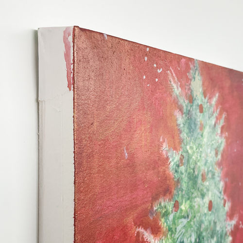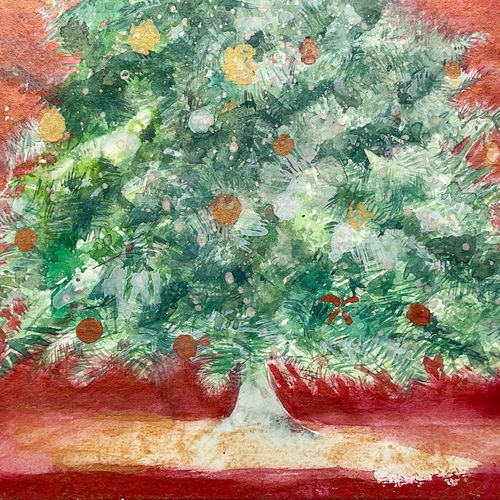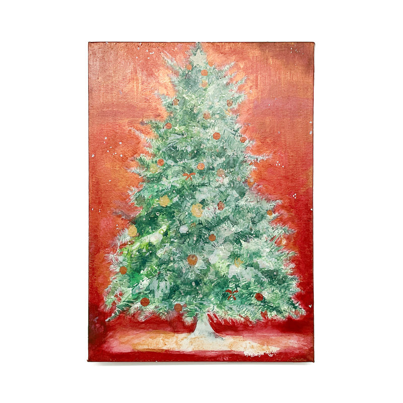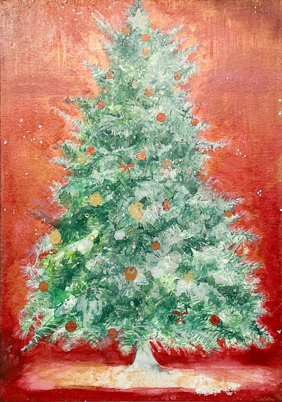 クリスマスらしい赤の空間にキラキラしたツリーが立っています。